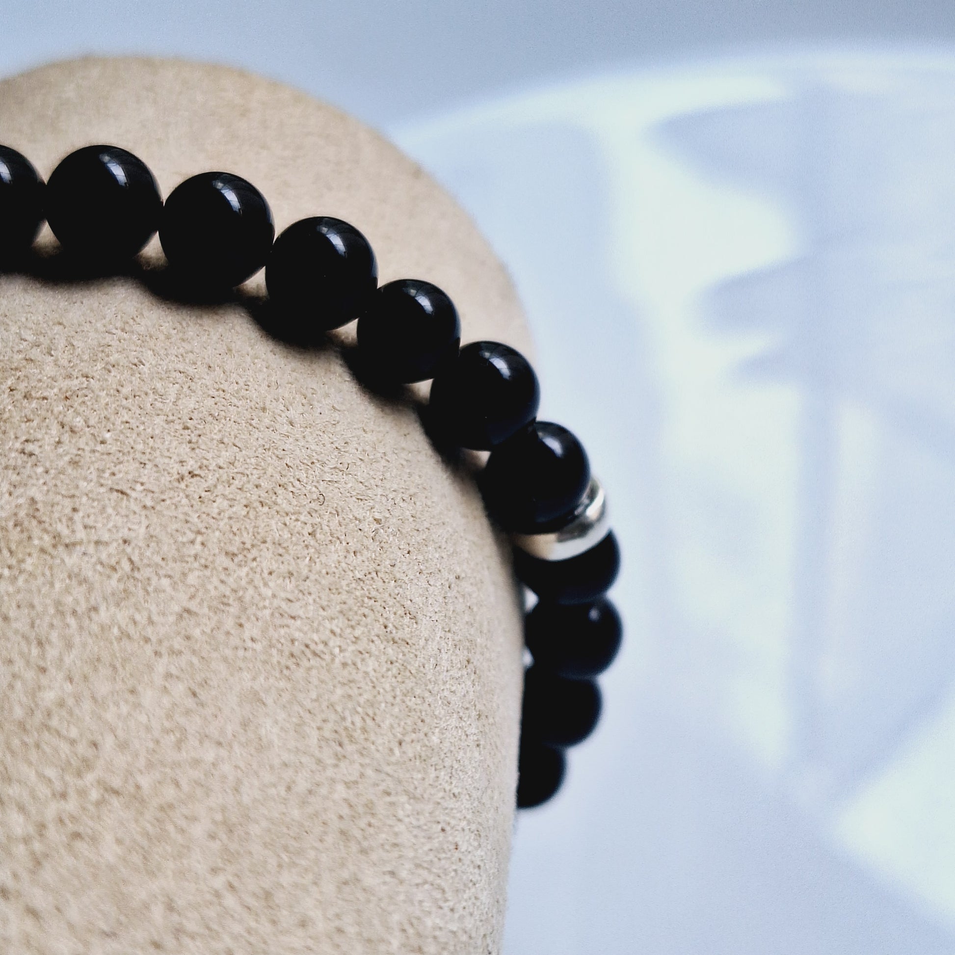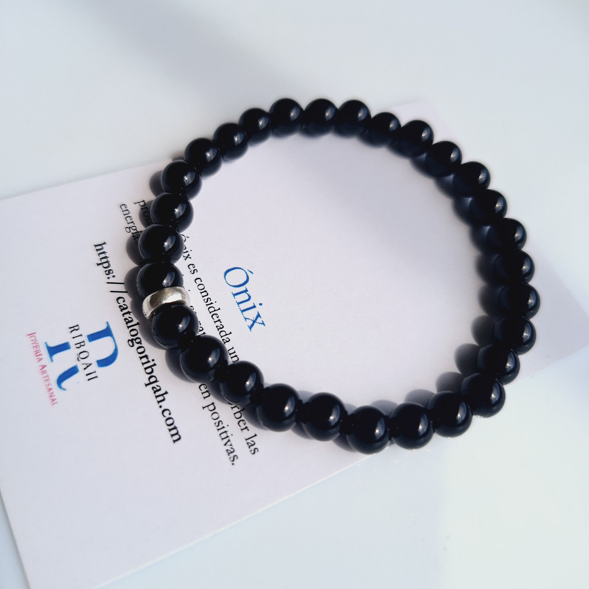 Pulsera con estilo clasico y discreto con cuentas de onix cuidadosamente pulidas, esta pieza combina sencillez, energía suave y elegancia atemporal